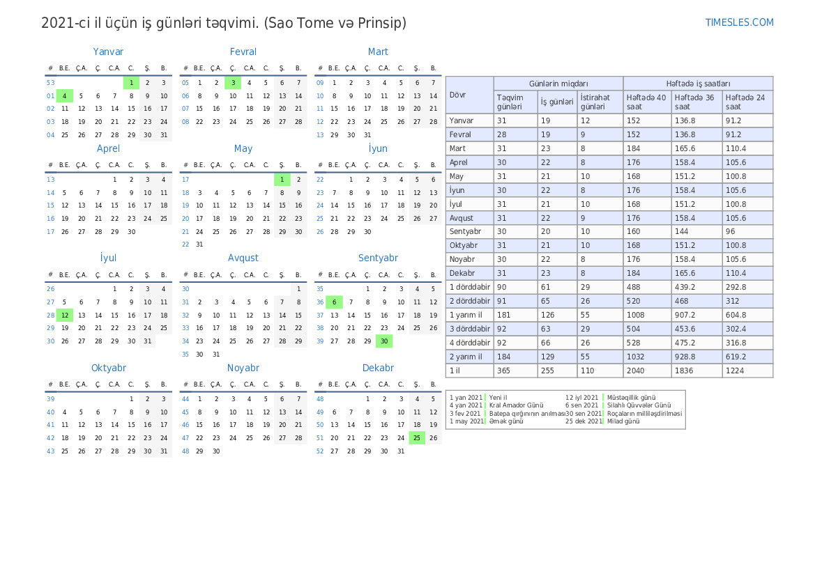 Sao Tome və Prinsip üçün 2021-ci ilin 2 rübü üçün tətil və həftə sonları ilə iş günləri təqvimi