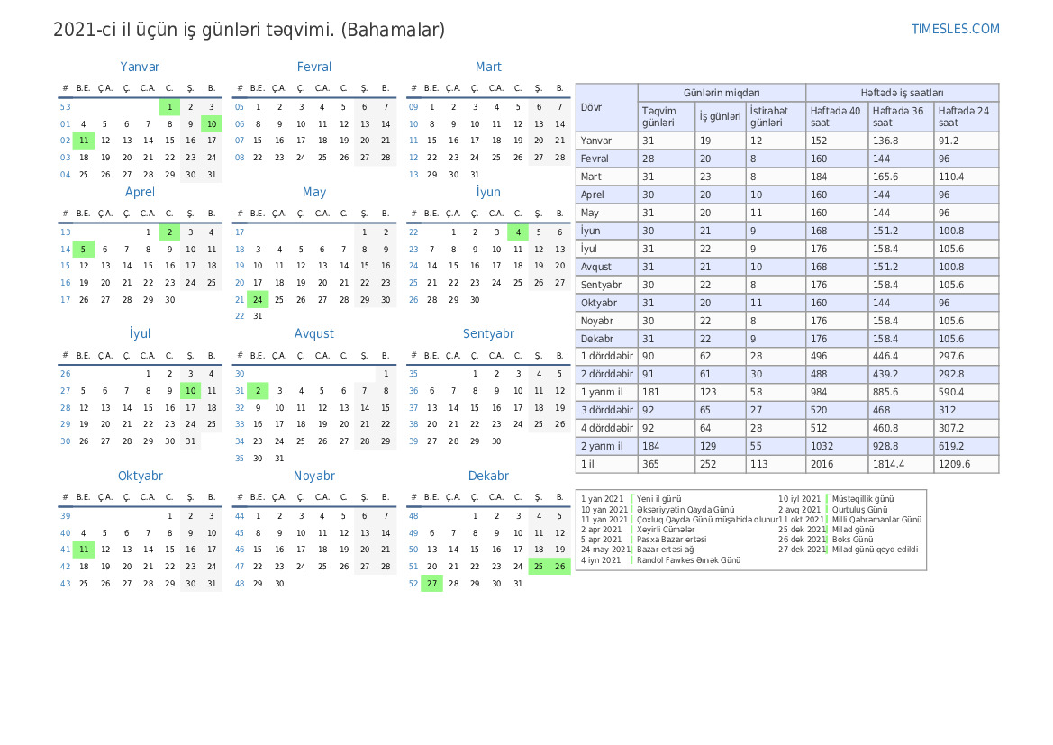 Bahamalar üçün 2021-ci ilin 3 rübü üçün tətil və həftə sonları ilə iş günləri təqvimi