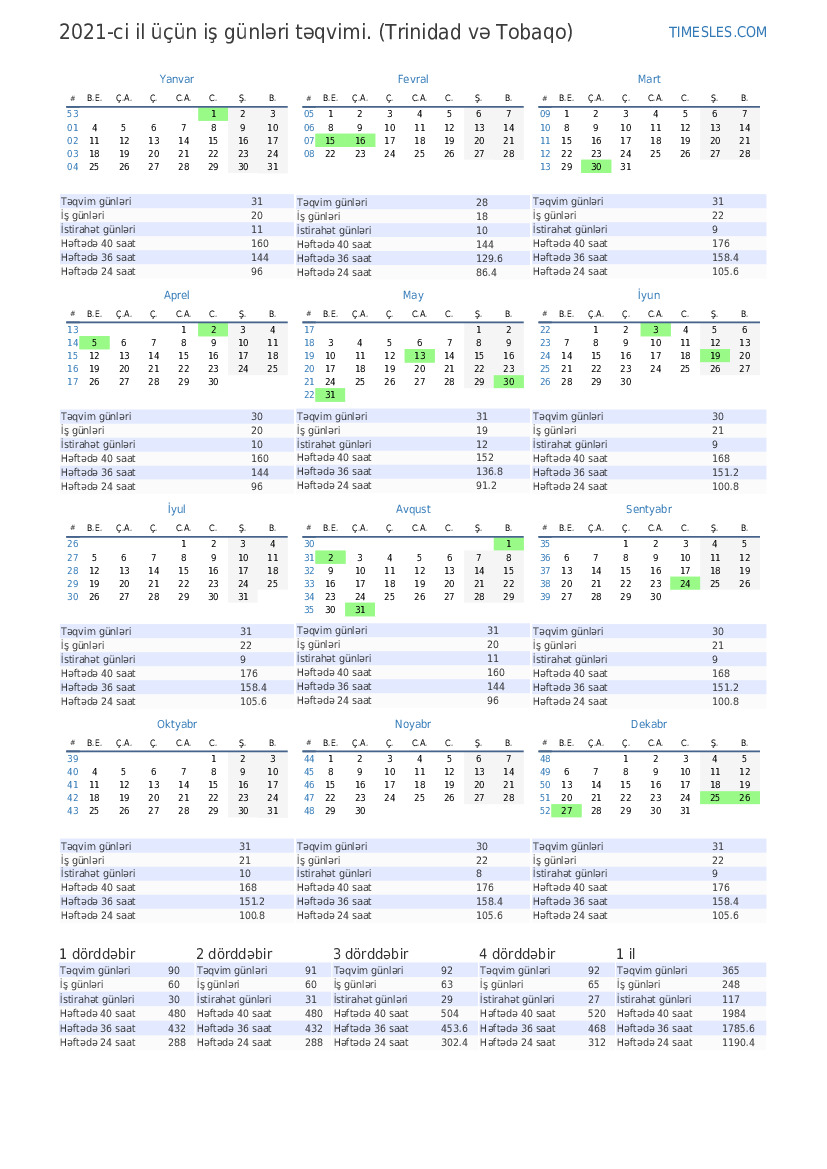 Trinidad və Tobaqo üçün 2021-ci ilin 4 rübü üçün tətil və həftə sonları ilə iş günləri təqvimi