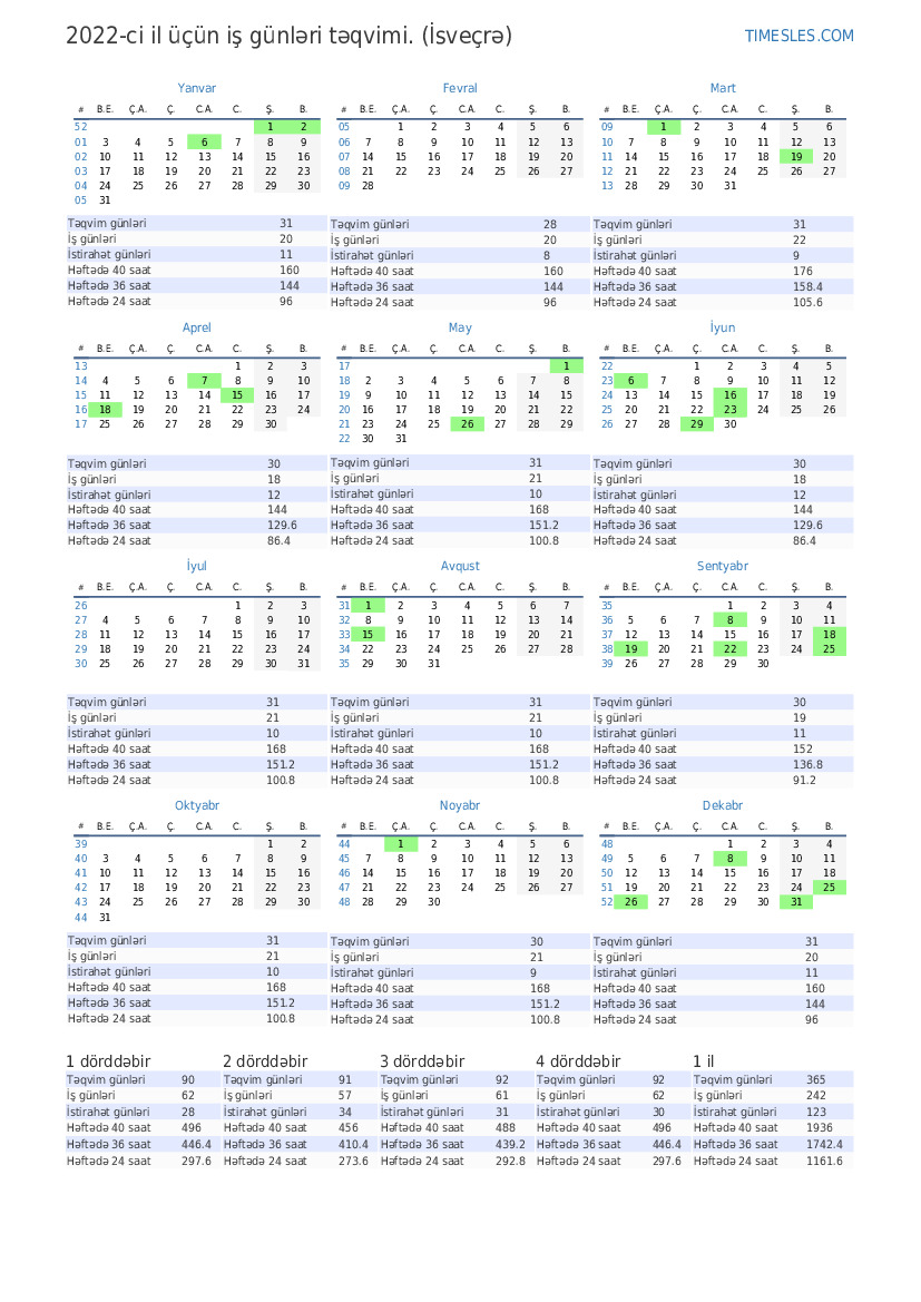 İsveçrə üçün 2022-ci ilin 2 rübü üçün tətil və həftə sonları ilə iş günləri təqvimi