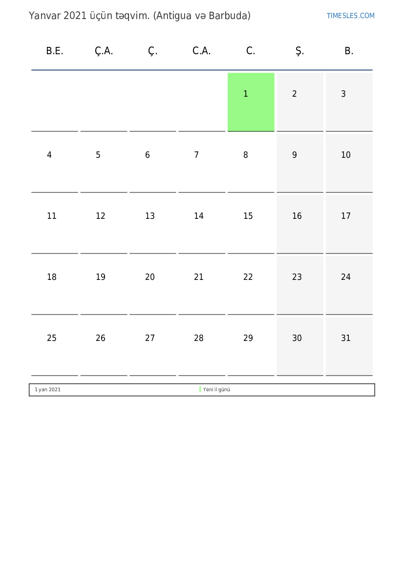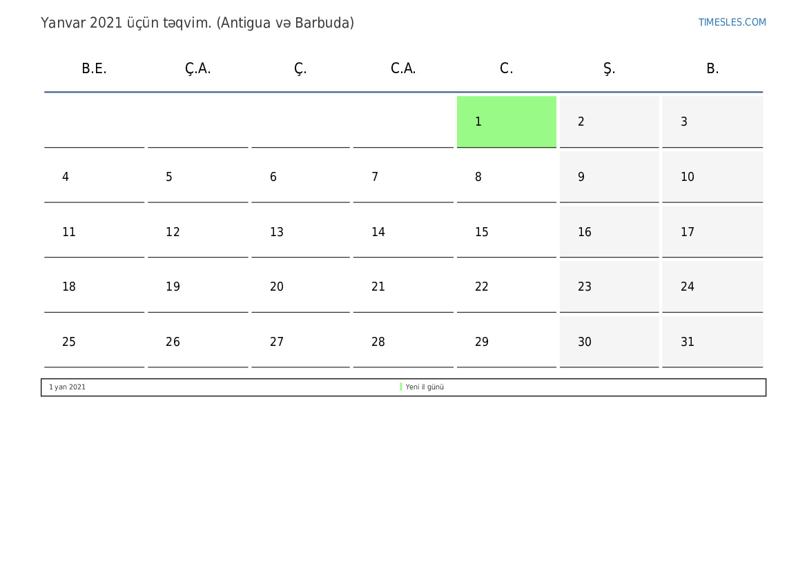 Antigua və Barbuda üçün Yanvar 2021 üçün Tətillər və Həftə Sonları Təqvim