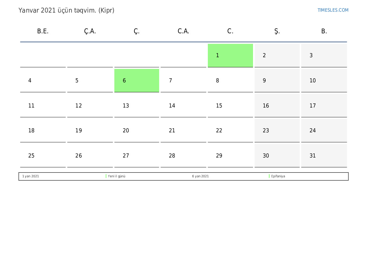 Kipr üçün Yanvar 2021 üçün Tətillər və Həftə Sonları Təqvim