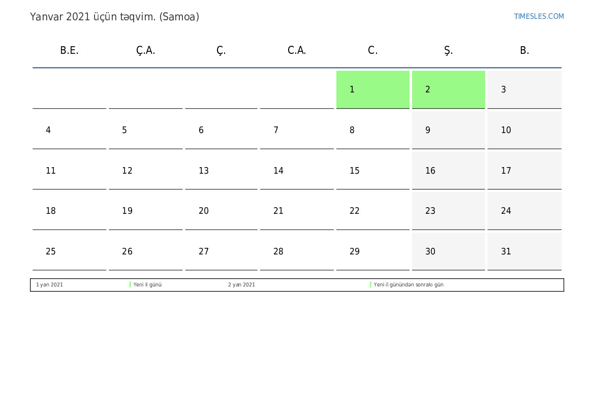 Samoa üçün Yanvar 2021 üçün Tətillər və Həftə Sonları Təqvim