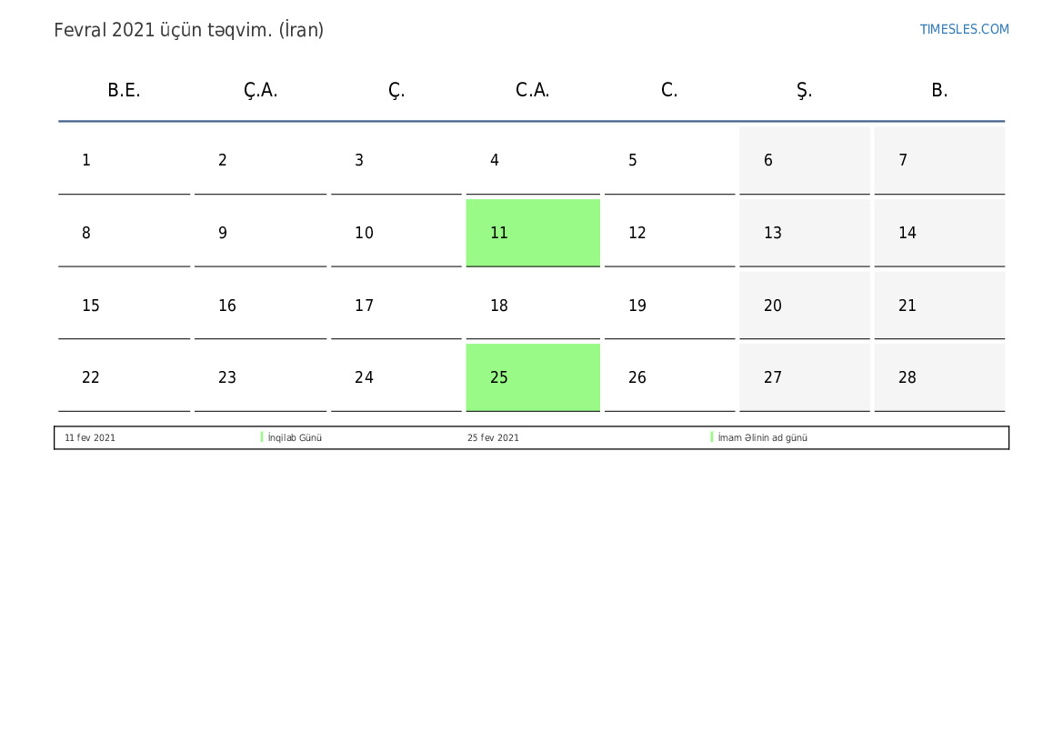 Fevral ayı 28 gün əhatə edir. Bu, 2021-ci ilin 2 ayıdır. İlin mövsümü: qış. Fevral ayı bazar ertəsi başlayır və bazar günü bitir. 2021-ci ilin Fevral ayında İranda 2 tətil və istirahət günləri var.