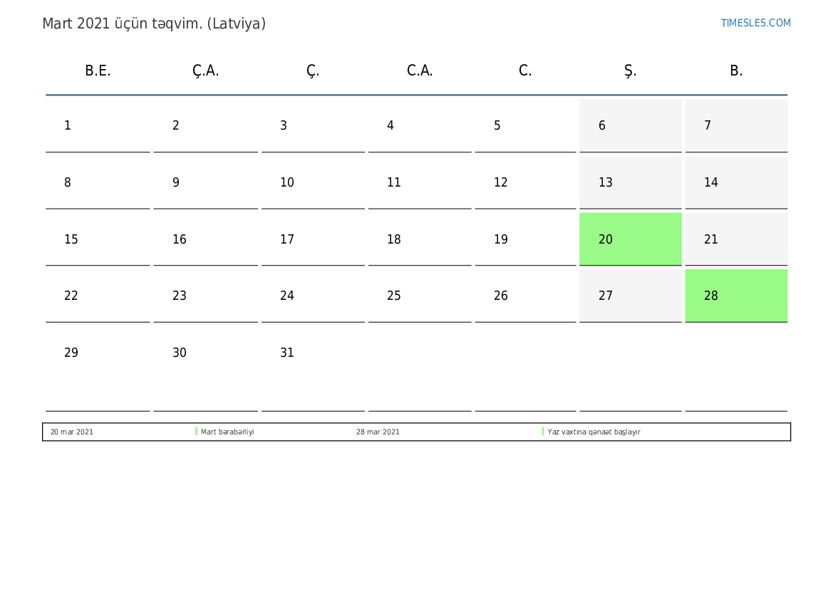 Latviya üçün Mart 2021 üçün tətil və həftə sonları ilə PDF təqvimini yükləyin və çap edin