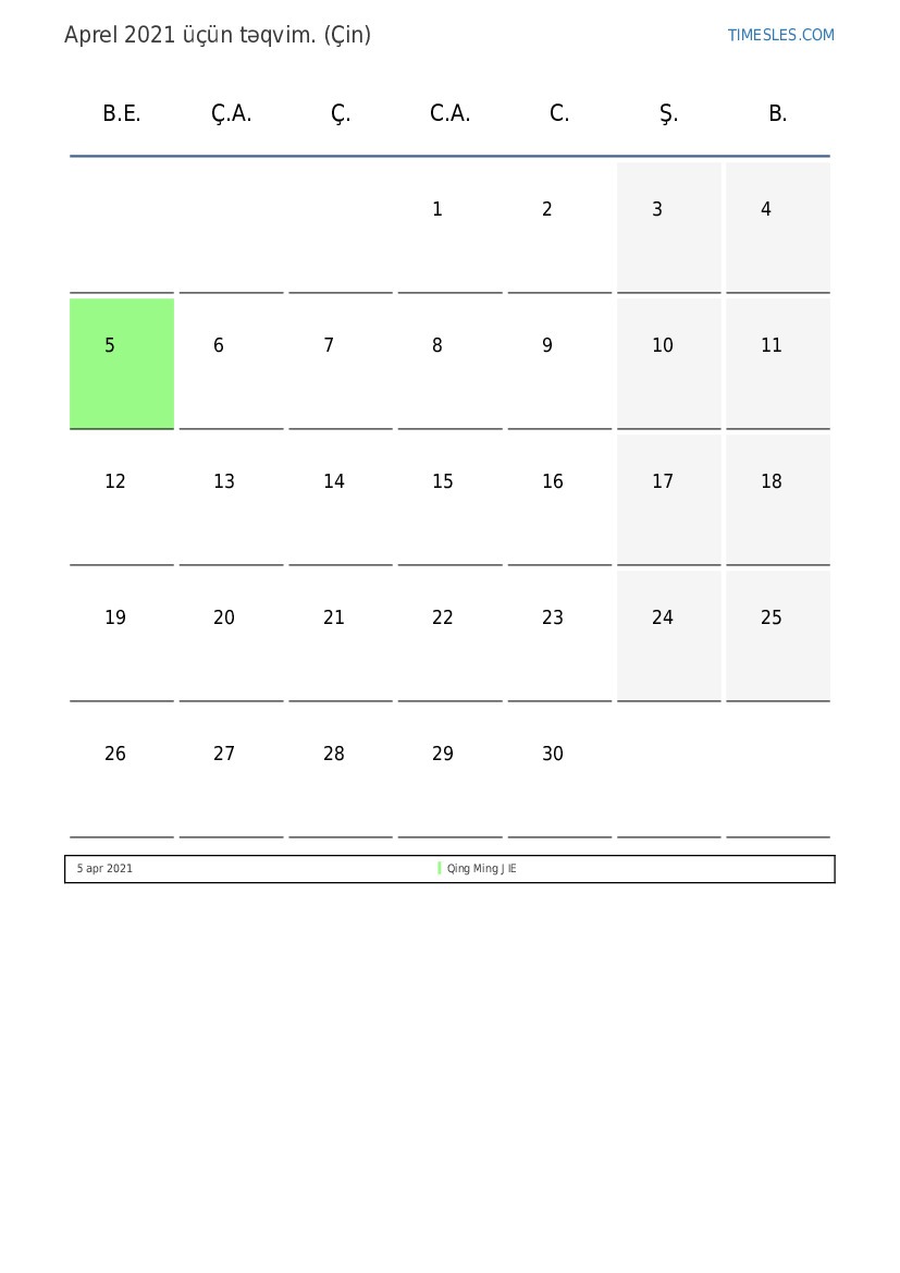 Çin üçün Aprel 2021 üçün Tətillər və Həftə Sonları Təqvim