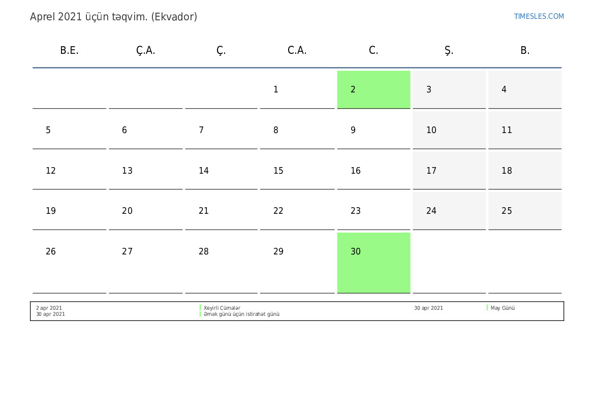 Ekvador üçün Aprel 2021 üçün Tətillər və Həftə Sonları Təqvim