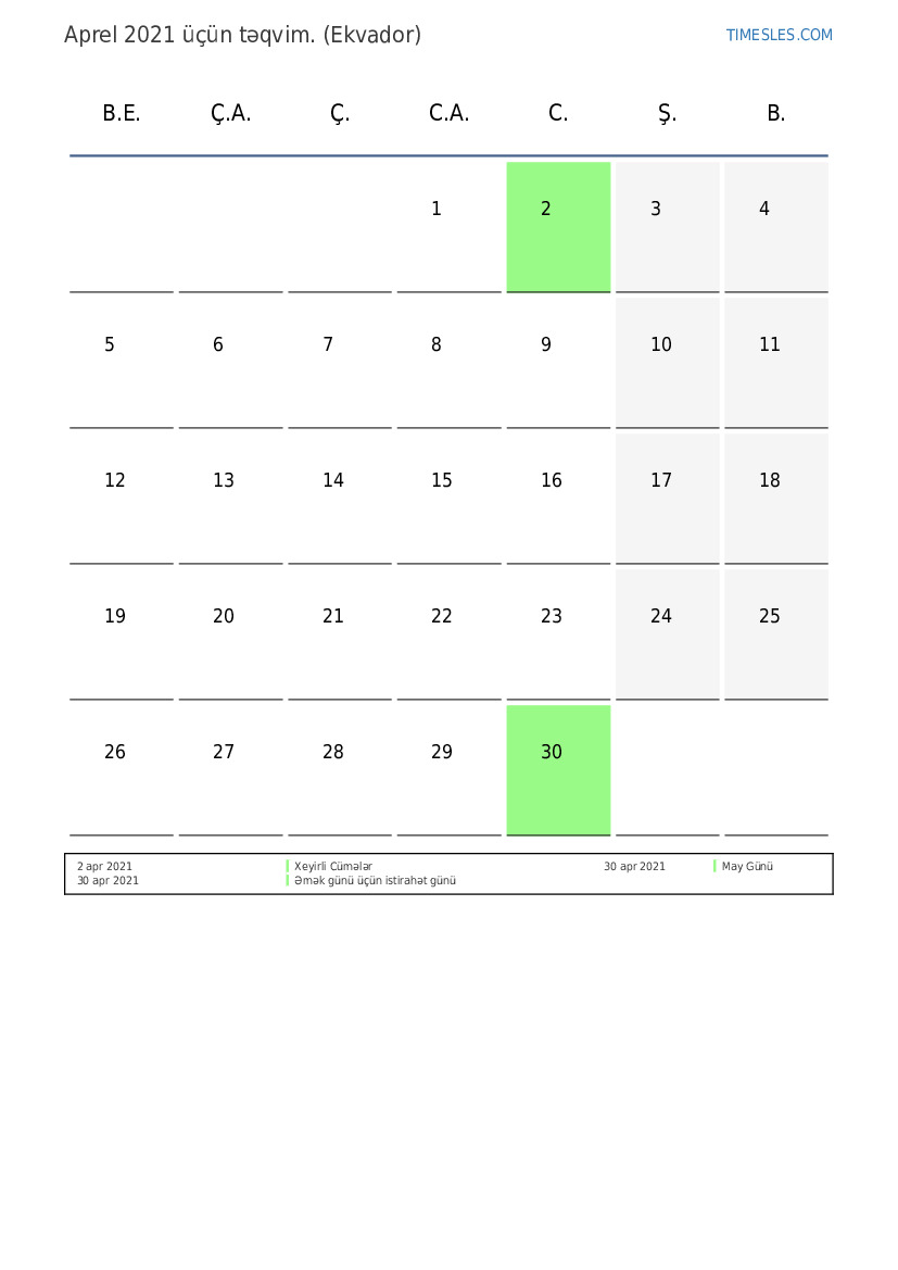 Ekvador üçün Aprel 2021 üçün tətil və həftə sonları ilə PDF təqvimini yükləyin və çap edin