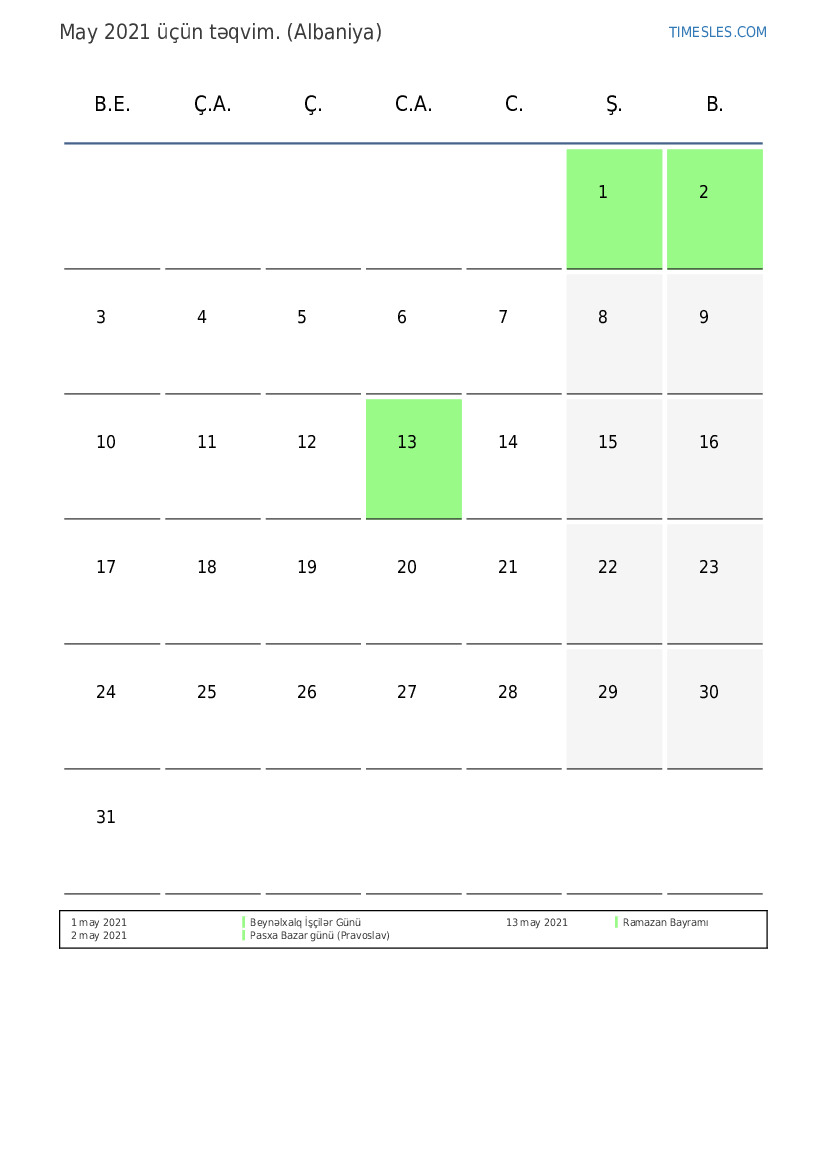 Albaniya üçün May 2021 üçün tətil və həftə sonları ilə PDF təqvimini yükləyin və çap edin