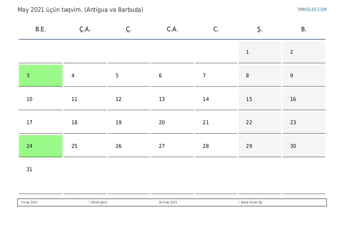 Antigua və Barbuda üçün May 2021 üçün Tətillər və Həftə Sonları Təqvim