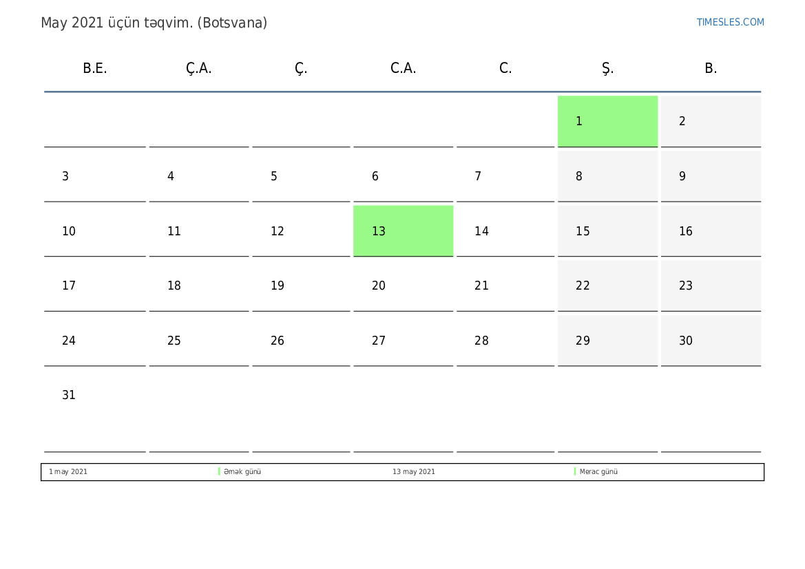 Botsvana üçün May 2021 üçün Tətillər və Həftə Sonları Təqvim