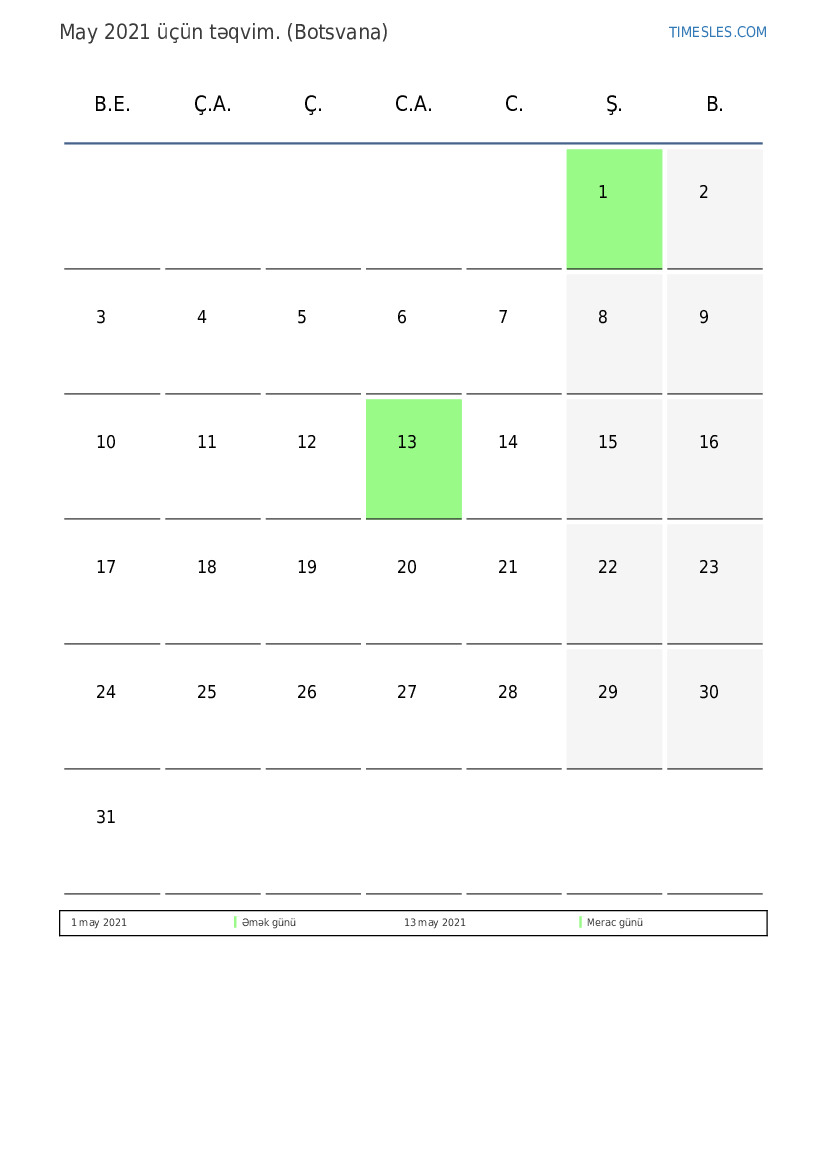 Botsvana üçün May 2021 üçün tətil və həftə sonları ilə PDF təqvimini yükləyin və çap edin