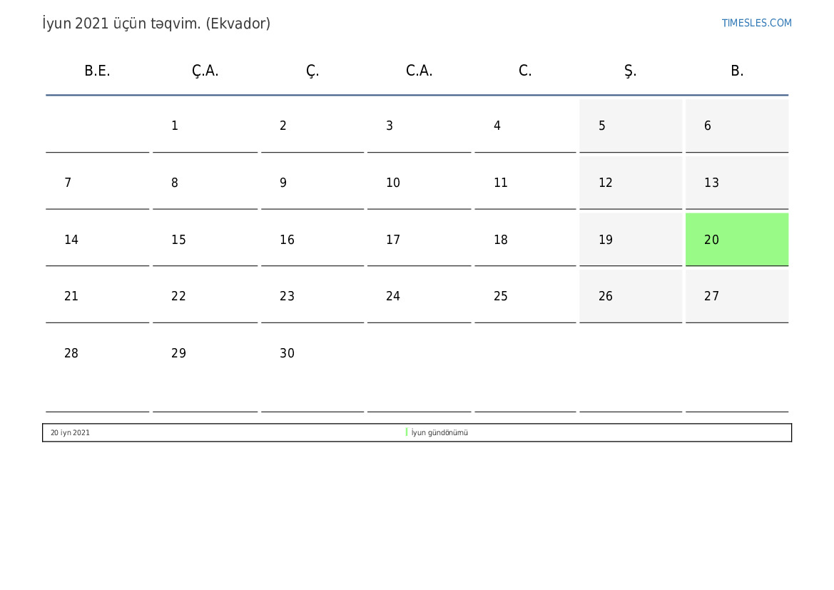 Ekvador üçün İyun 2021 üçün tətil və həftə sonları ilə PDF təqvimini yükləyin və çap edin