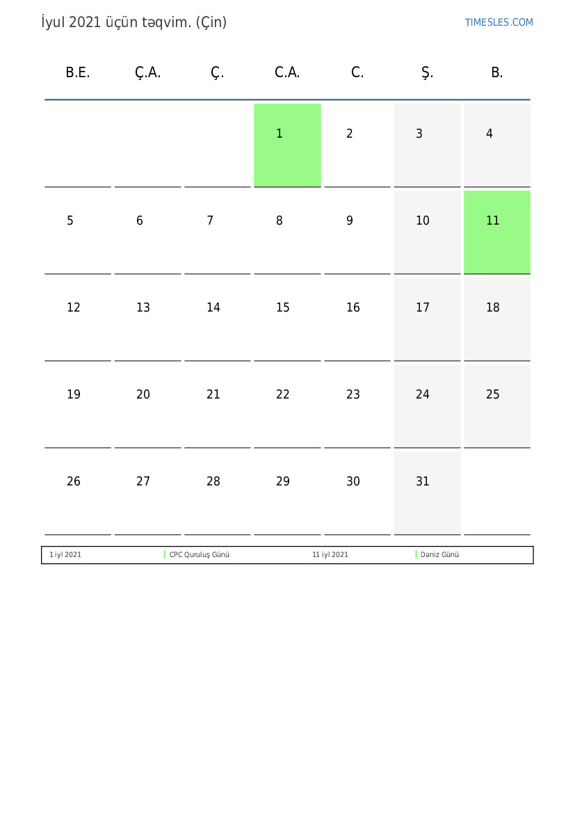 Çin üçün İyul 2021 üçün tətil və həftə sonları ilə PDF təqvimini yükləyin və çap edin