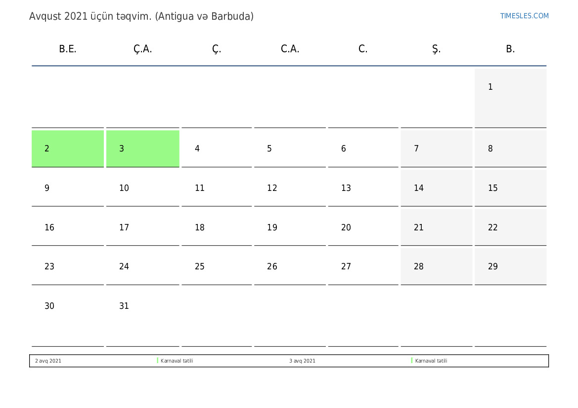 Antigua və Barbuda üçün Avqust 2021 təqvimi