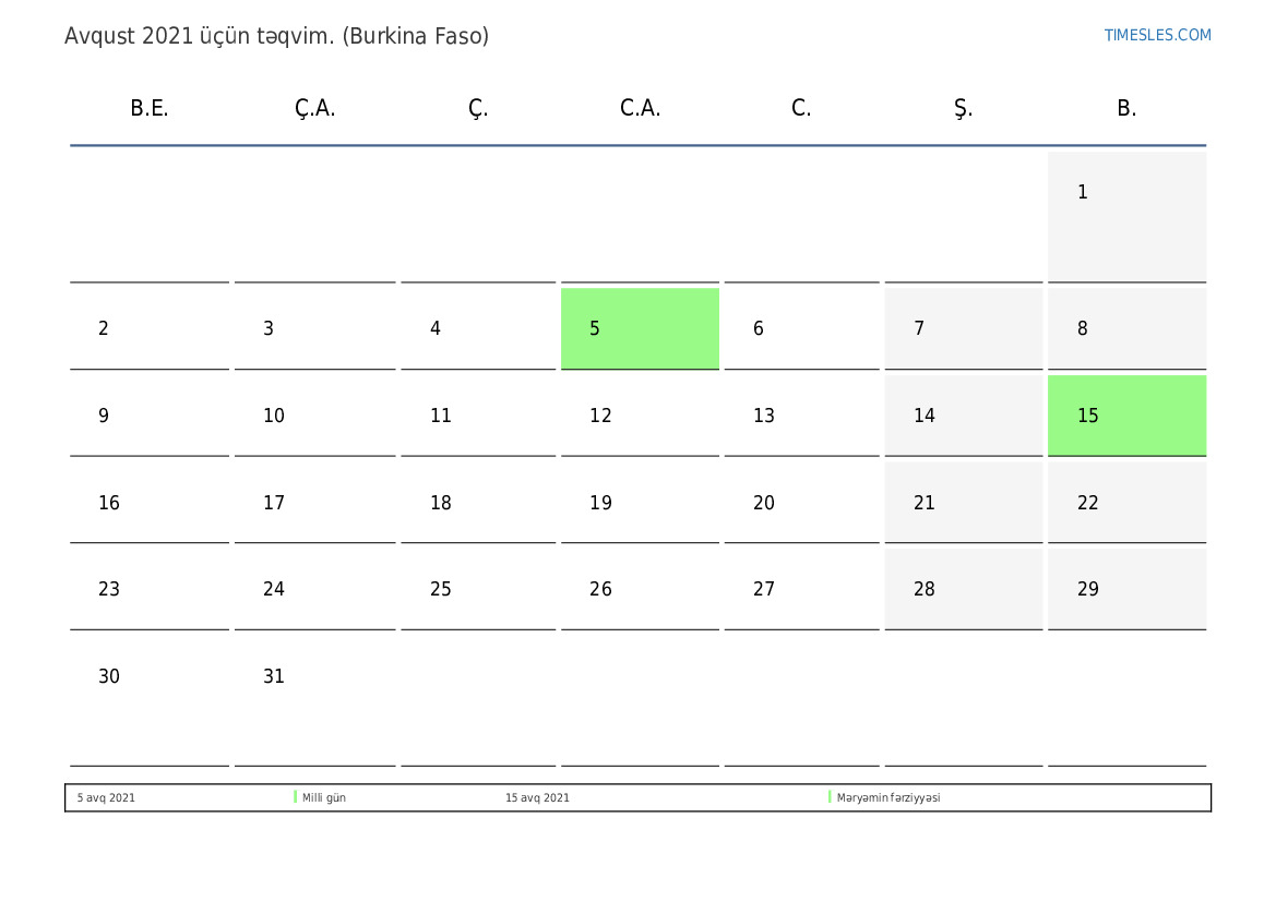 Burkina Faso üçün Avqust 2021 üçün Tətillər və Həftə Sonları Təqvim