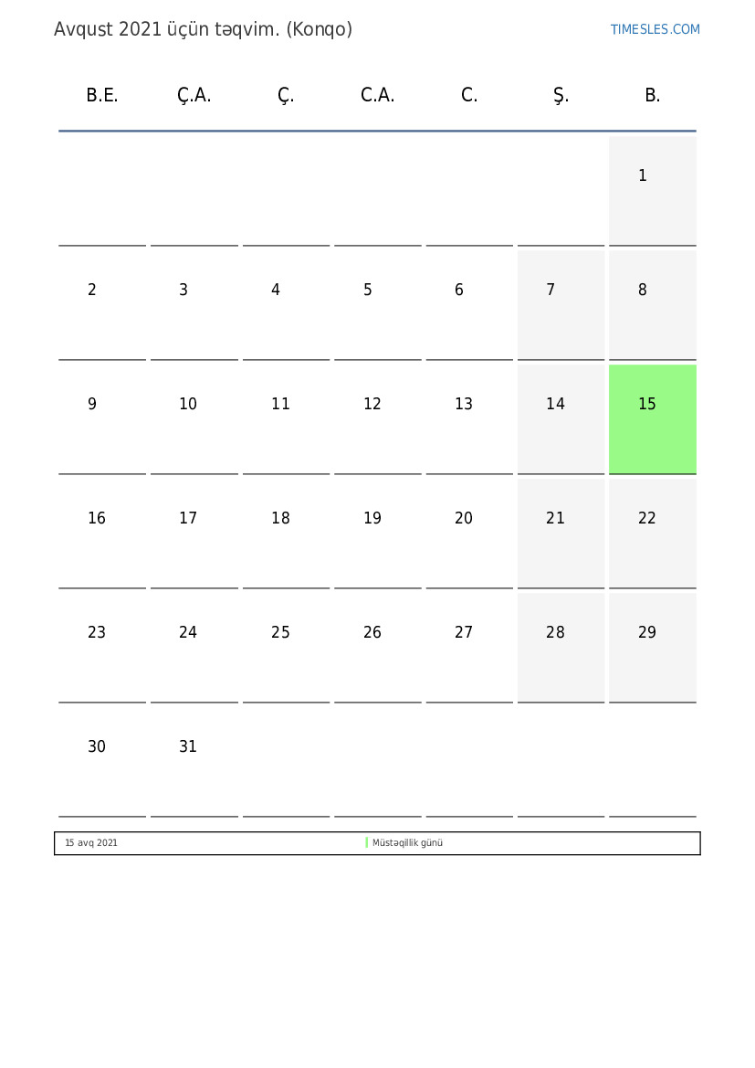 Konqo üçün Avqust 2021 üçün Tətillər və Həftə Sonları Təqvim