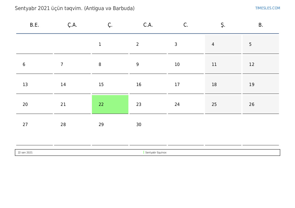 Antigua və Barbuda üçün Sentyabr 2021 təqvimi