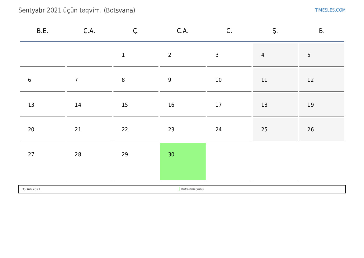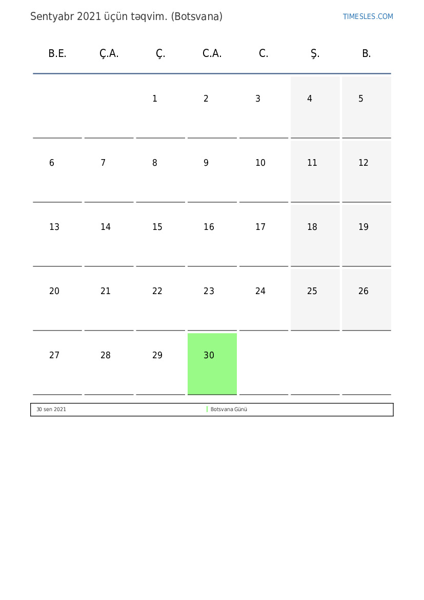 Botsvana üçün Sentyabr 2021 üçün tətil və həftə sonları ilə PDF təqvimini yükləyin və çap edin