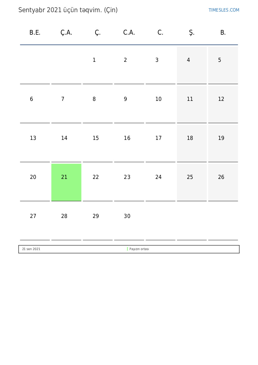 Çin üçün Sentyabr 2021 üçün tətil və həftə sonları ilə PDF təqvimini yükləyin və çap edin