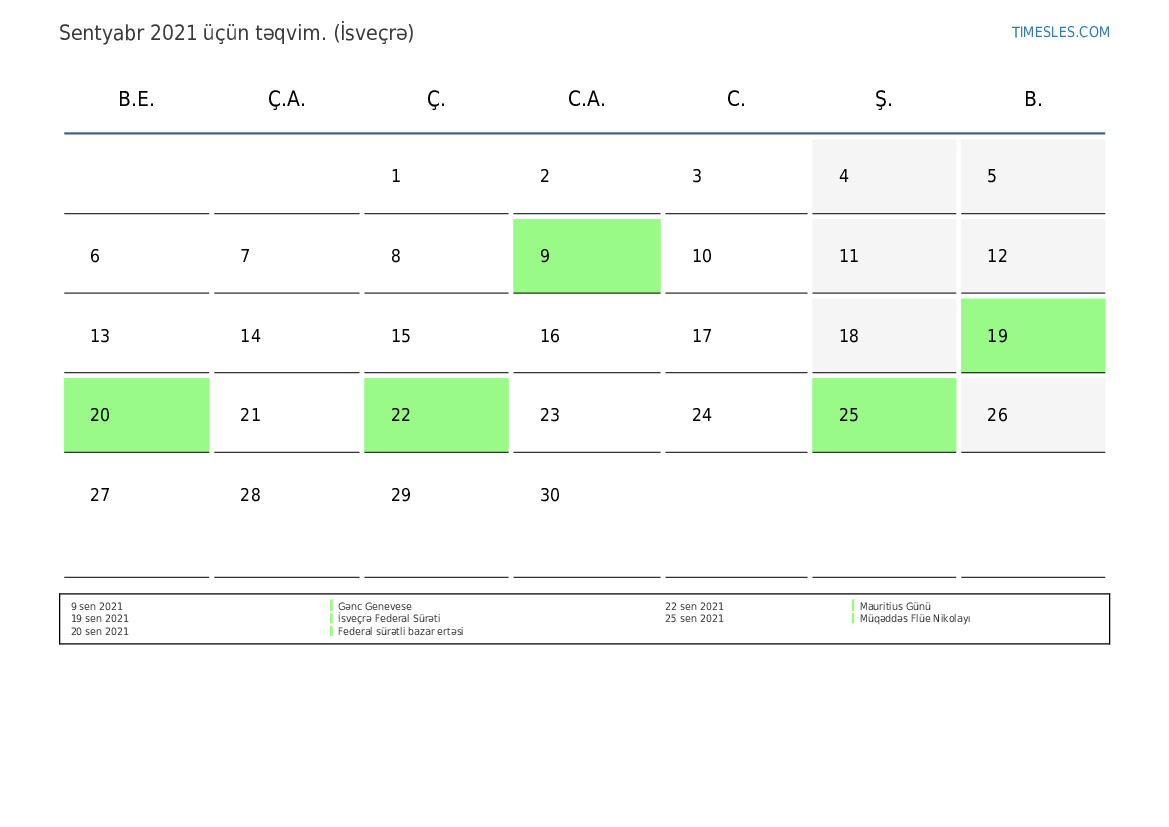 İsveçrə üçün Sentyabr 2021 üçün Tətillər və Həftə Sonları Təqvim