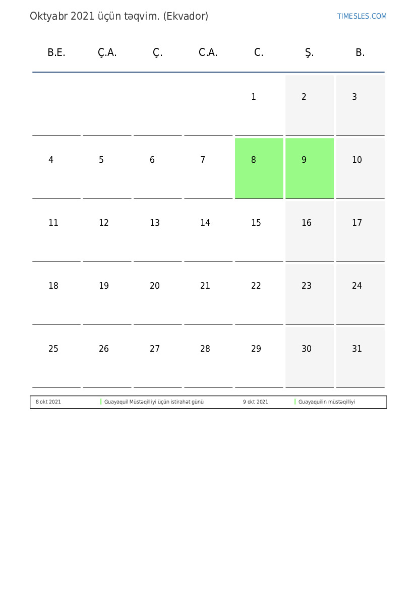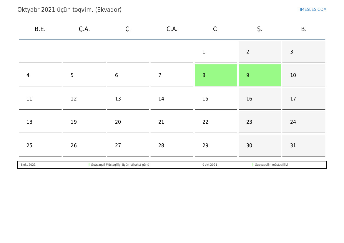 Ekvador üçün Oktyabr 2021 üçün Tətillər və Həftə Sonları Təqvim