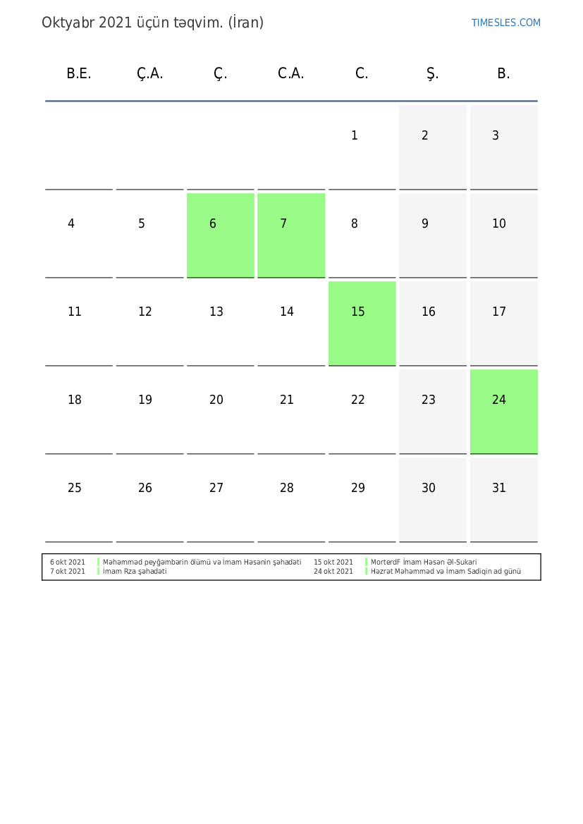 İran üçün Oktyabr 2021 üçün Tətillər və Həftə Sonları Təqvim