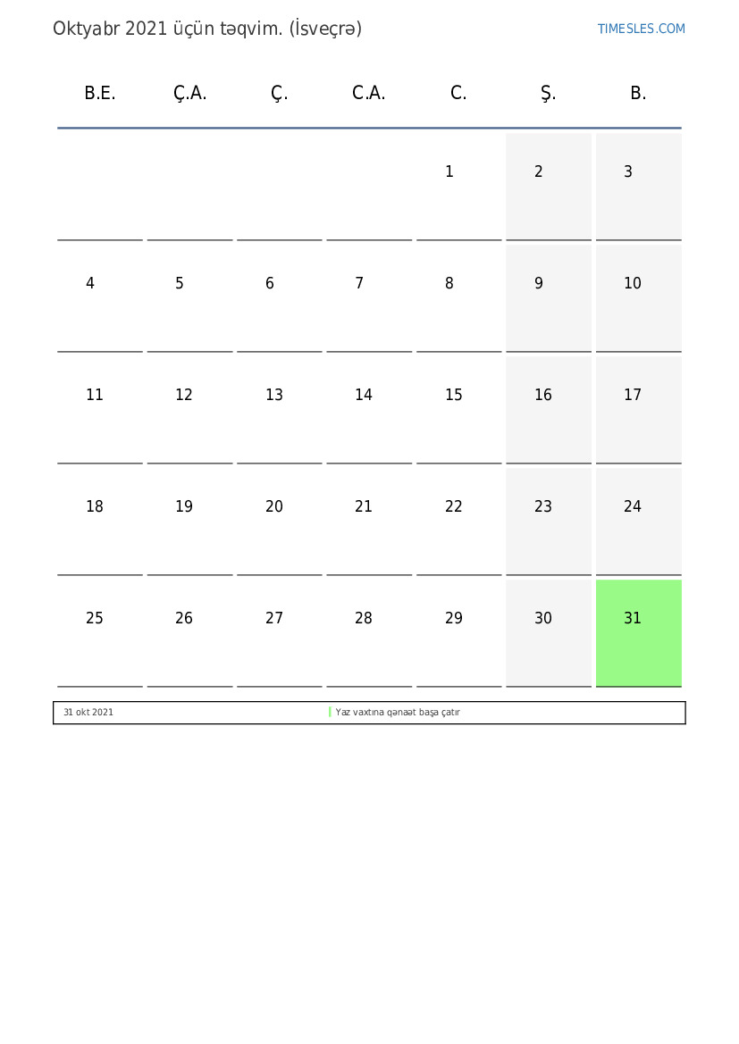 İsveçrə üçün Oktyabr 2021 üçün Tətillər və Həftə Sonları Təqvim