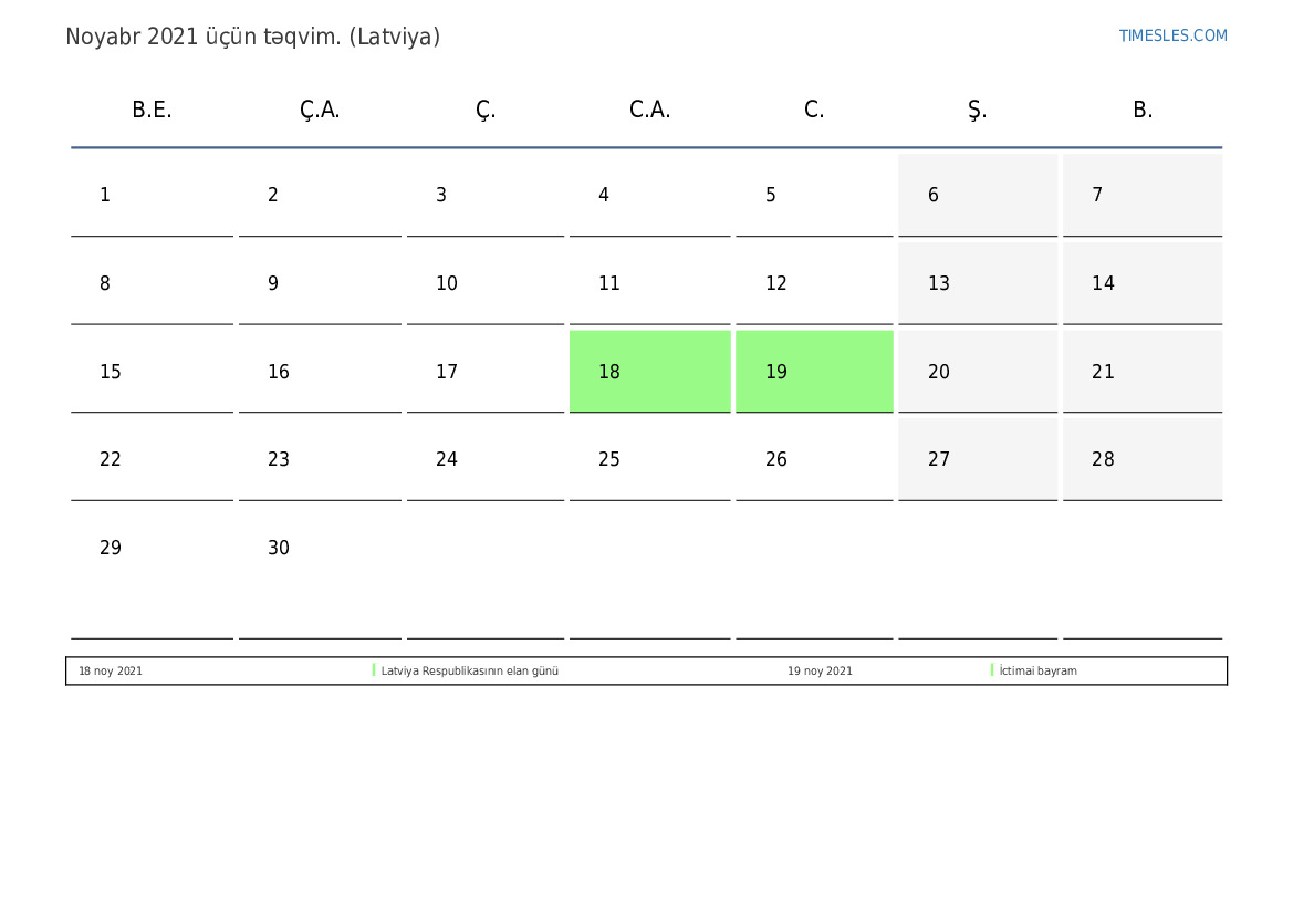 Latviya üçün Noyabr 2021 üçün tətil və həftə sonları ilə PDF təqvimini yükləyin və çap edin