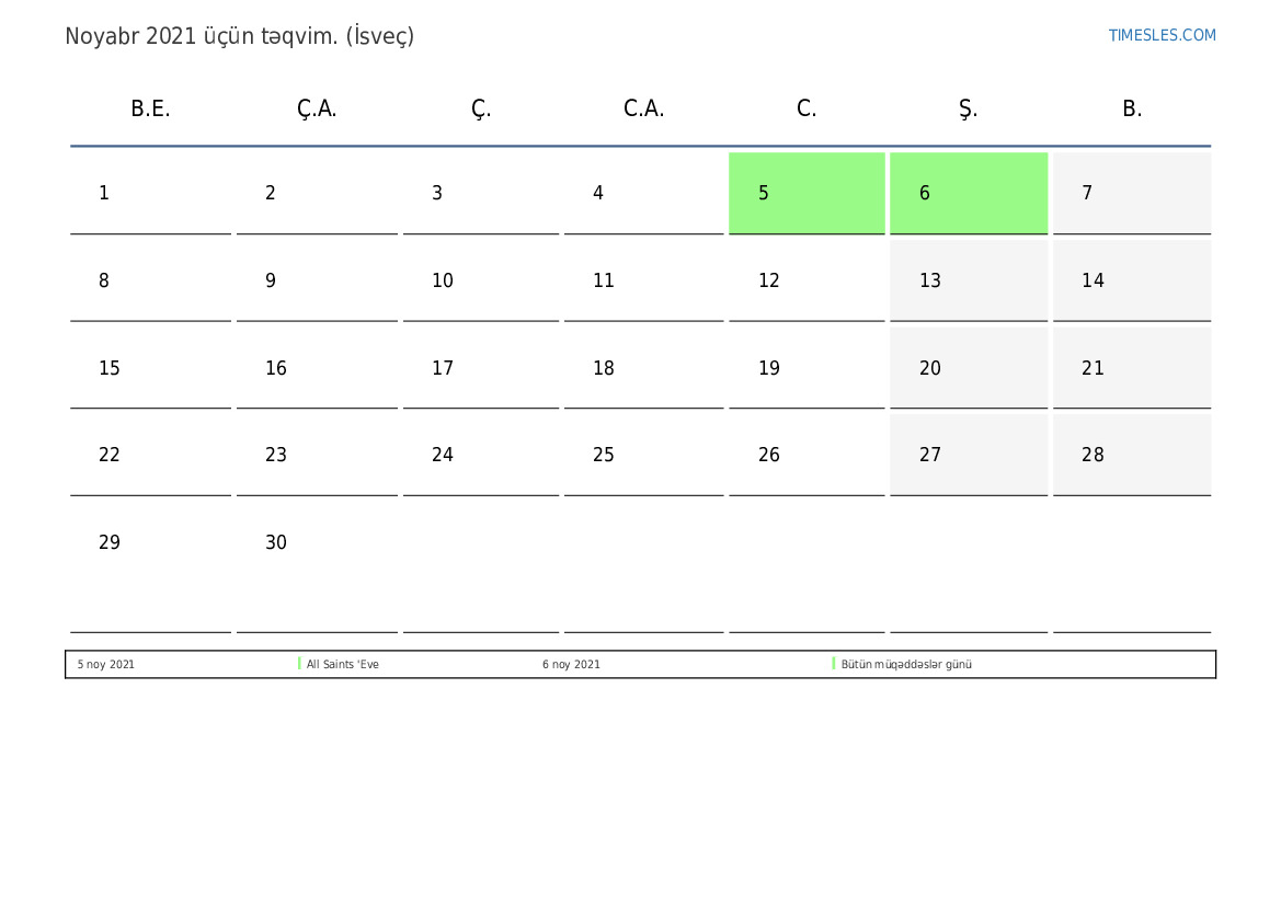 İsveç üçün Noyabr 2021 təqvimi