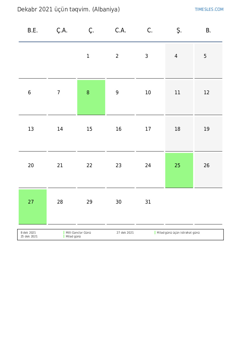 Albaniya üçün Dekabr 2021 üçün Tətillər və Həftə Sonları Təqvim