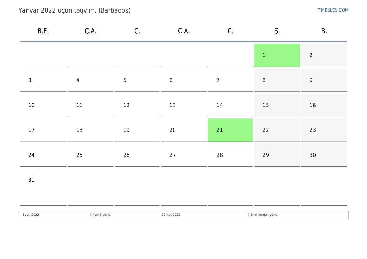 Barbados üçün Yanvar 2022 üçün Tətillər və Həftə Sonları Təqvim