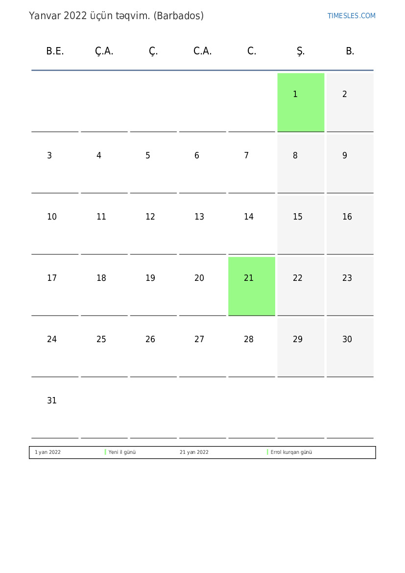 Barbados üçün Yanvar 2022 üçün tətil və həftə sonları ilə PDF təqvimini yükləyin və çap edin