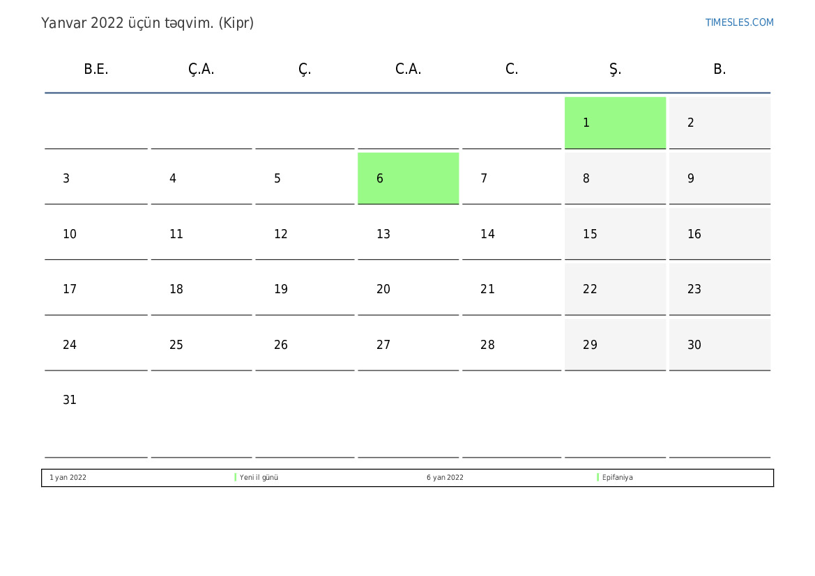 Kipr üçün Yanvar 2022 üçün tətil və həftə sonları ilə PDF təqvimini yükləyin və çap edin