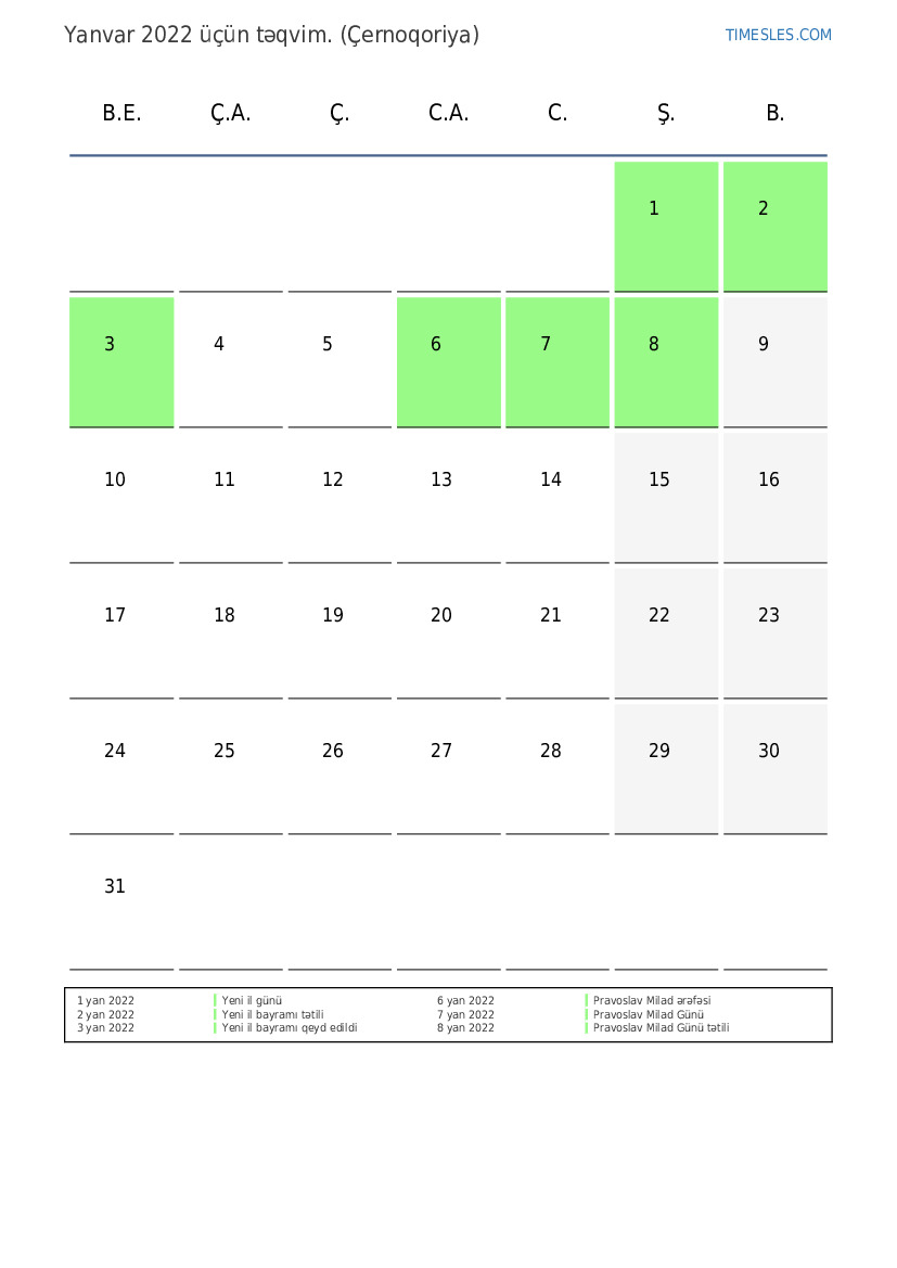 Montenegro üçün Yanvar 2022 üçün Tətillər və Həftə Sonları Təqvim
