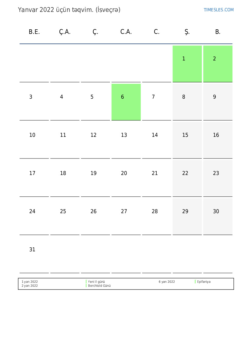 İsveçrə üçün Yanvar 2022 üçün Tətillər və Həftə Sonları Təqvim