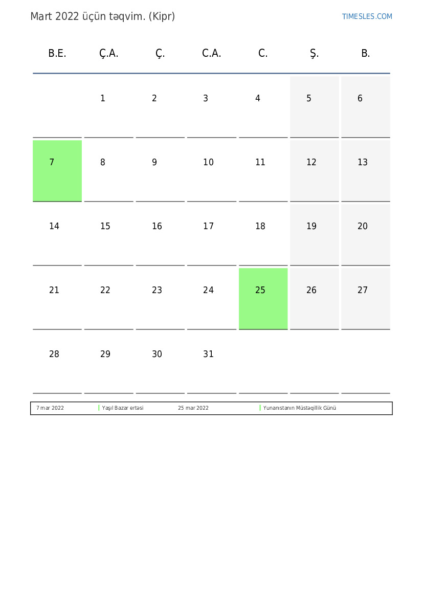 Kipr üçün Mart 2022 üçün tətil və həftə sonları ilə PDF təqvimini yükləyin və çap edin