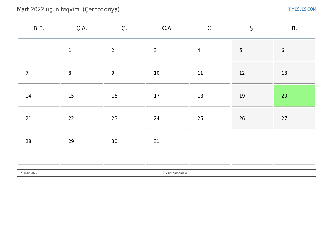 Montenegro üçün Mart 2022 üçün tətil və həftə sonları ilə PDF təqvimini yükləyin və çap edin