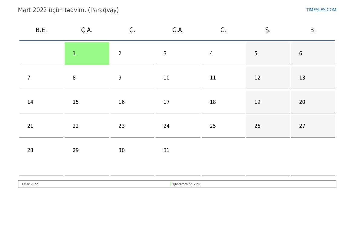 Paraqvay üçün Mart 2022 üçün tətil və həftə sonları ilə PDF təqvimini yükləyin və çap edin
