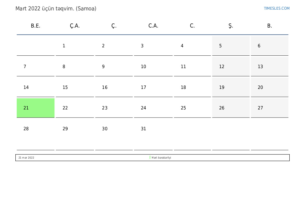 Samoa üçün Mart 2022 üçün tətil və həftə sonları ilə PDF təqvimini yükləyin və çap edin