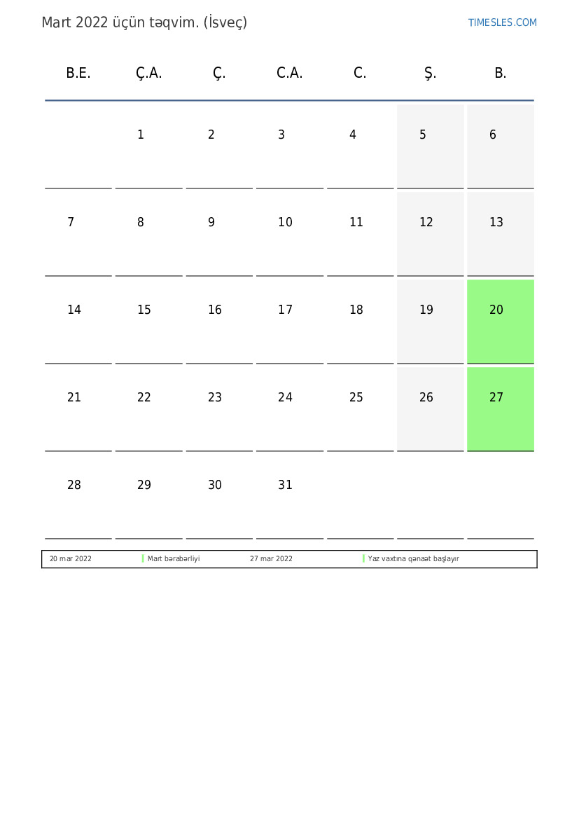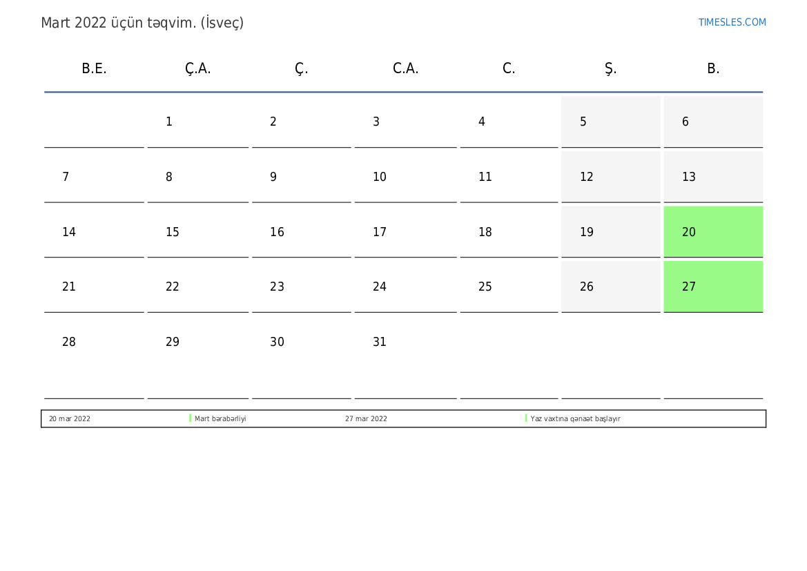 İsveç üçün Mart 2022 təqvimi