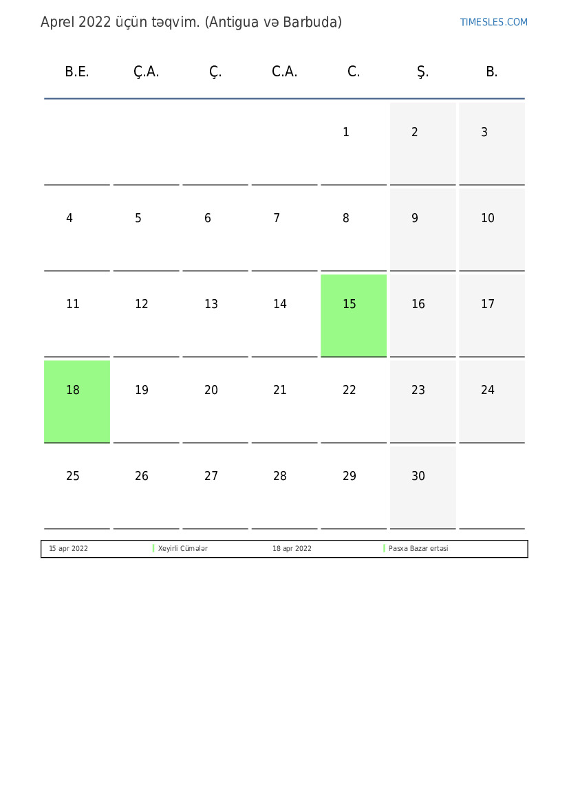 Antigua və Barbuda üçün Aprel 2022 üçün tətil və həftə sonları ilə PDF təqvimini yükləyin və çap edin