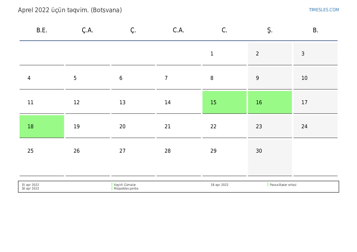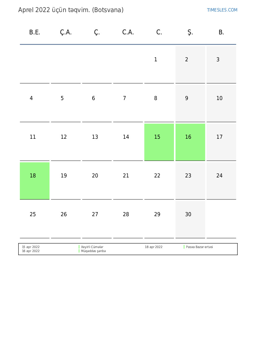 Botsvana üçün Aprel 2022 üçün tətil və həftə sonları ilə PDF təqvimini yükləyin və çap edin