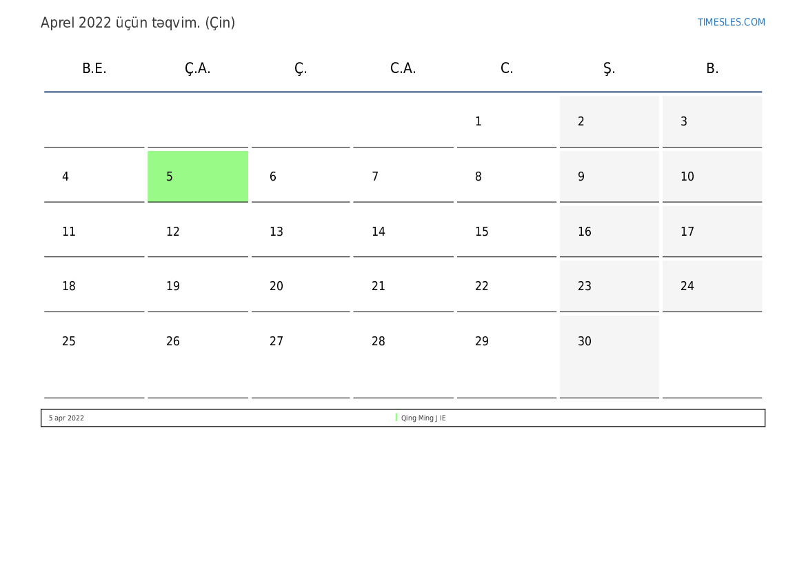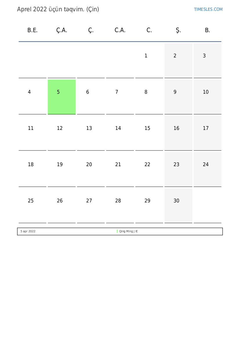 Çin üçün Aprel 2022 üçün Tətillər və Həftə Sonları Təqvim