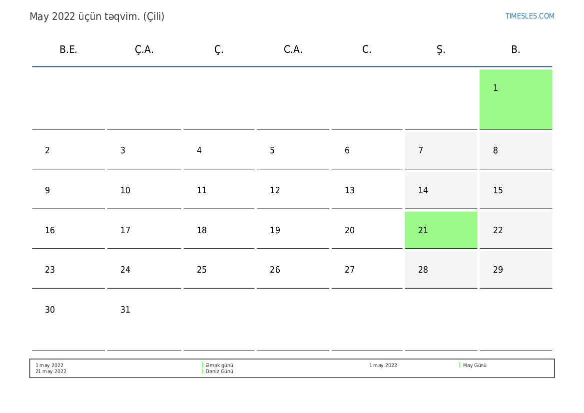 Çili üçün May 2022 üçün tətil və həftə sonları ilə PDF təqvimini yükləyin və çap edin
