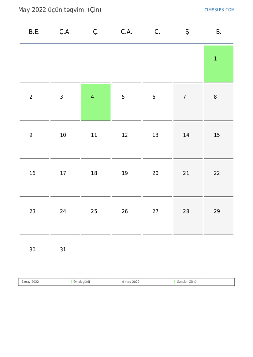 Çin üçün May 2022 üçün Tətillər və Həftə Sonları Təqvim