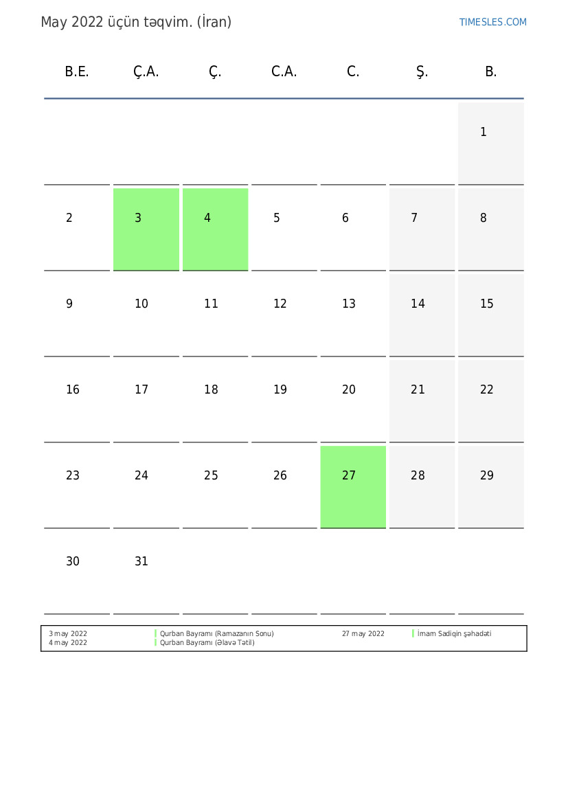 İran üçün May 2022 üçün Tətillər və Həftə Sonları Təqvim