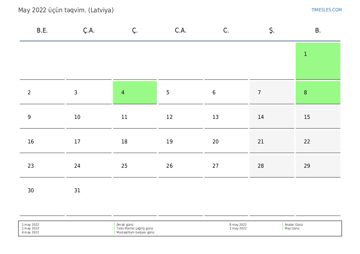 Latviya üçün May 2022 üçün tətil və həftə sonları ilə PDF təqvimini yükləyin və çap edin