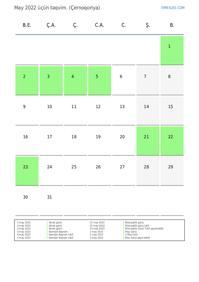 Montenegro üçün May 2022 üçün Tətillər və Həftə Sonları Təqvim