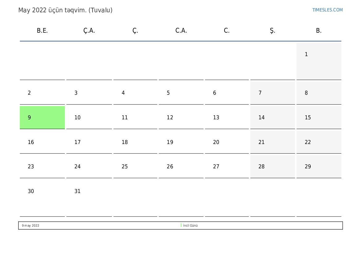 Tuvalu üçün May 2022 üçün tətil və həftə sonları ilə PDF təqvimini yükləyin və çap edin
